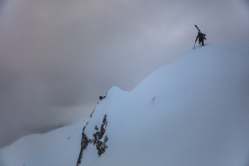 Katie Duffy hikes a peak in thick fog at Rainbow Ski Area near Nelson, Tasman, New Zealand.